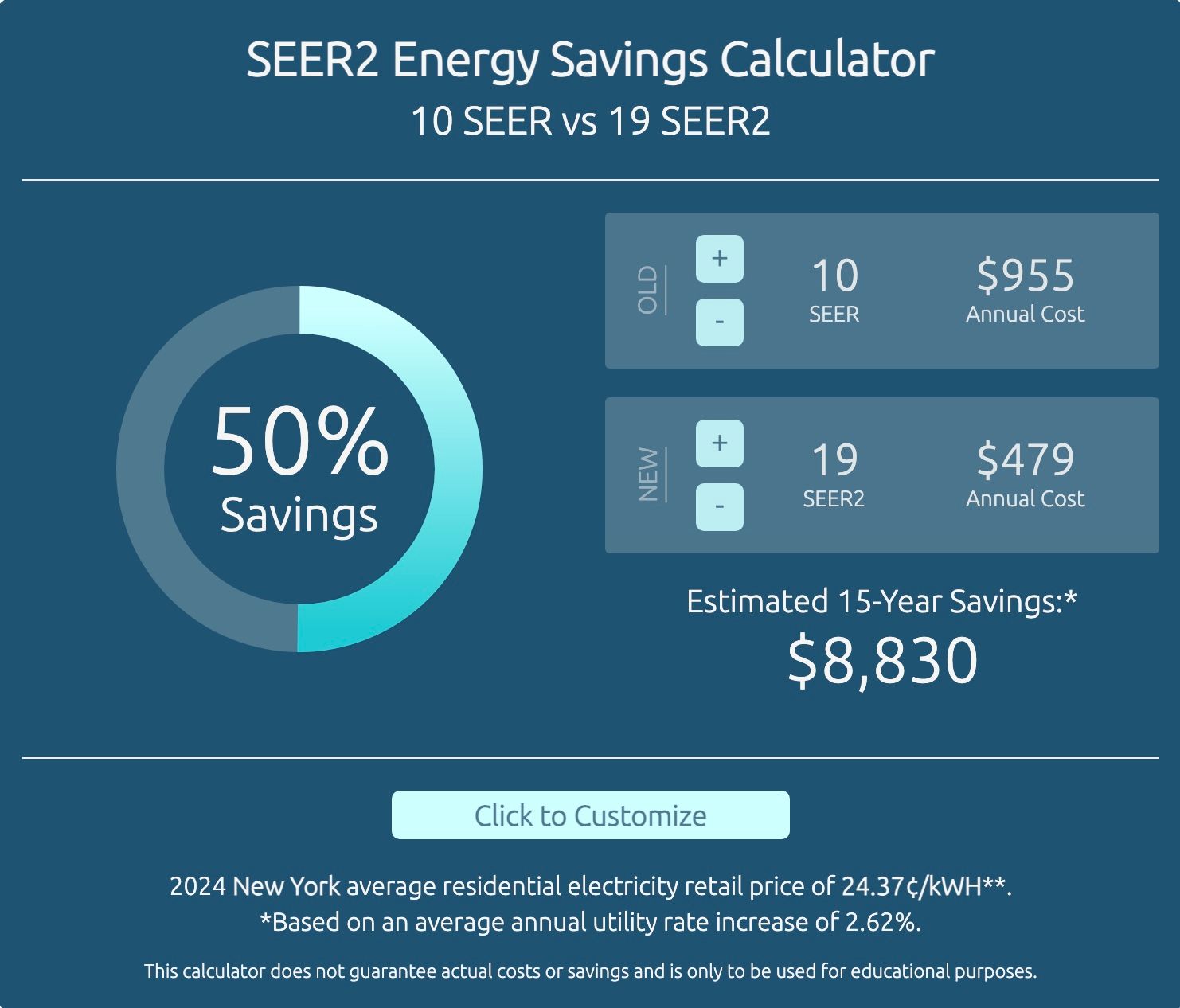 Our SEER2 (Seasonal Energy Efficiency Ratio 2) energy savings calculator can help determine how much you could save on your utility bills. Simply enter your current unit’s SEER value and compare it to a newer, more efficient SEER2 unit. You can even customize it to better match your home’s system for a more accurate calculation.