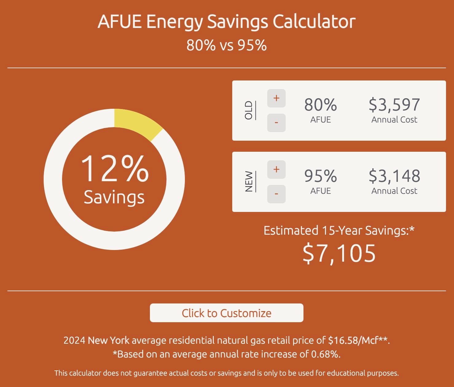 Our AFUE energy savings calculator can help determine how much you could save on your utility bills. Just enter your current unit’s AFUE value and compare it to a newer, more efficient system.